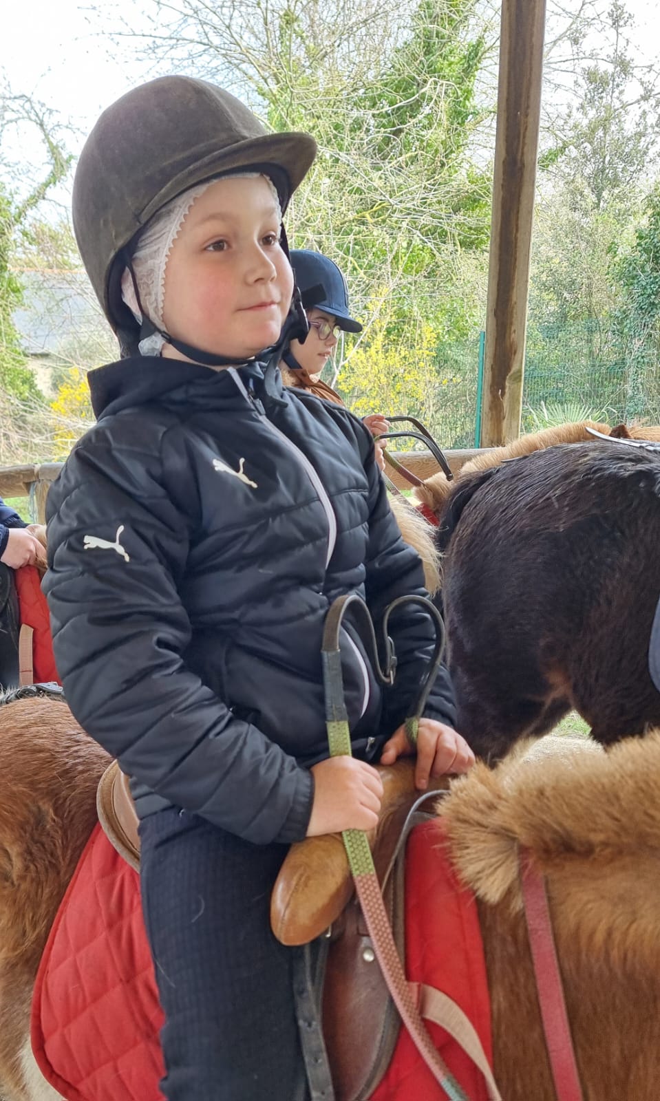 Aujourd'hui nous sommes allés au centre équestre de la Briantais. Nous avons brossé nos poneys et mis la selle. Puis nous sommes allés dans le manège où nous avons fait des petits jeux. Il y avait des poneys gourmands. Nous avons beaucoup aimé cette sortie.
